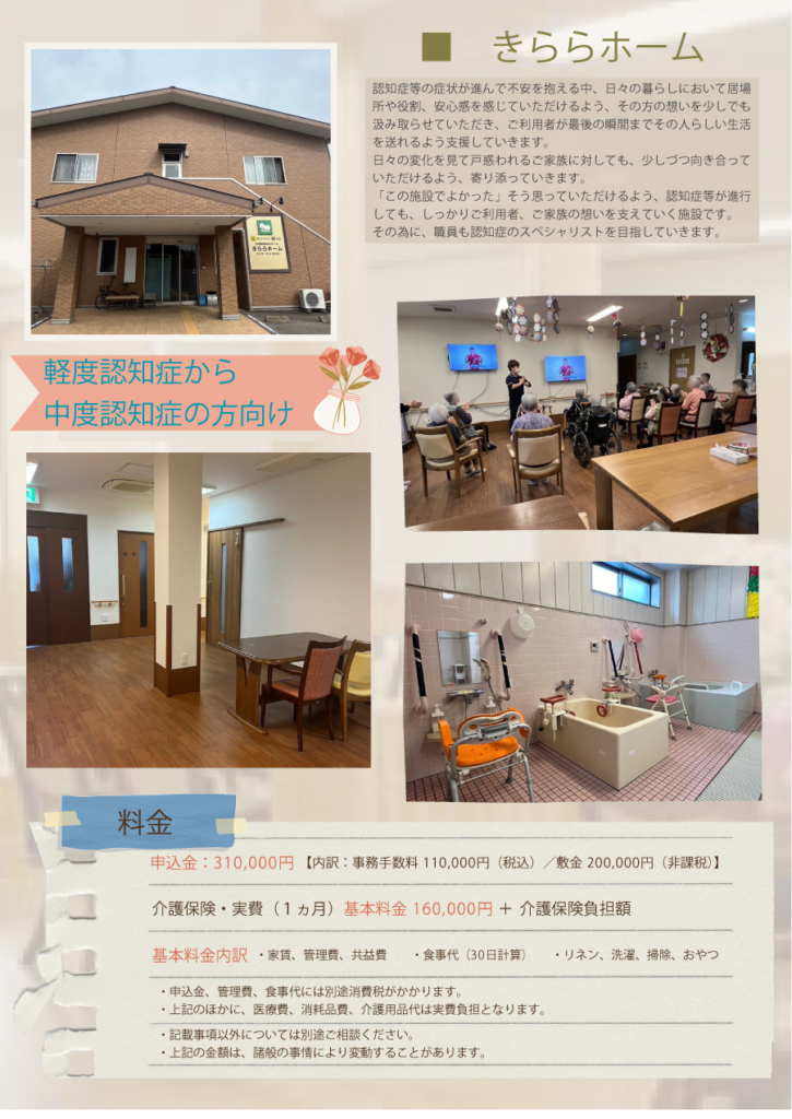 基本料金160,000円+介護保険負担額基本料金内訳:家賃、管理費、共益費、食事代(30日計算)、リネン、洗濯、掃除